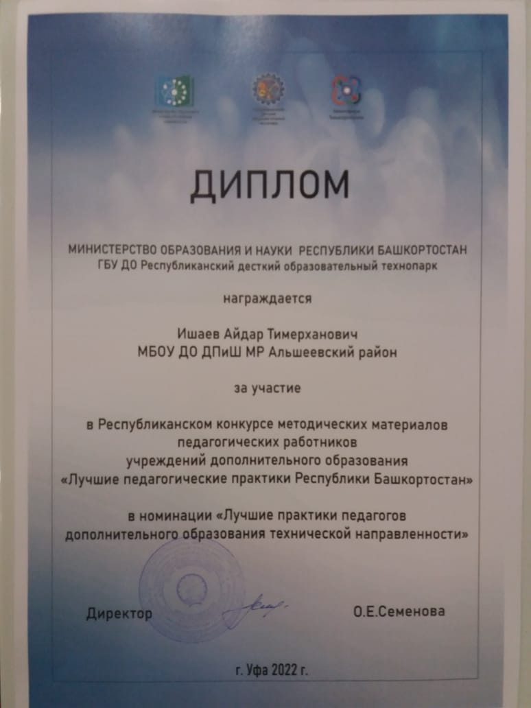 27-28 октября 22022 году ГБУ ДО Республиканский детский образовательный технопарк в сотрудничестве с ФГБОУ ВО Башкирский государственный педагогический университет им. М. Акмуллы провел Республиканский конкурс педагогических работников учреждений дополнительного образования «Лучшие педагогические практики Республики Башкортостан» . В нем принял активное участие и наш педагог Ишаев А.Т. в номинации «Лучшие практики педагогов ДО технической направленности».