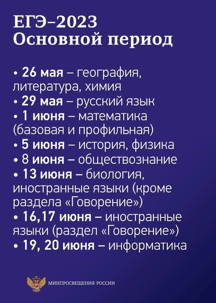 ЕГЭ по русскому языку в 2023 году планируется провести 29 мая. ЕГЭ по математике базового и профильного уровней планируется провести в один день – 1 июня.