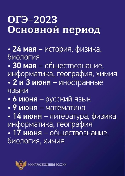 Проведение ОГЭ для выпускников 9 классов также разделено на три периода: досрочный (с 21 апреля по 16 мая), основной (с 24 мая по 1 июля) и дополнительный (с 4 по 23 сентября).