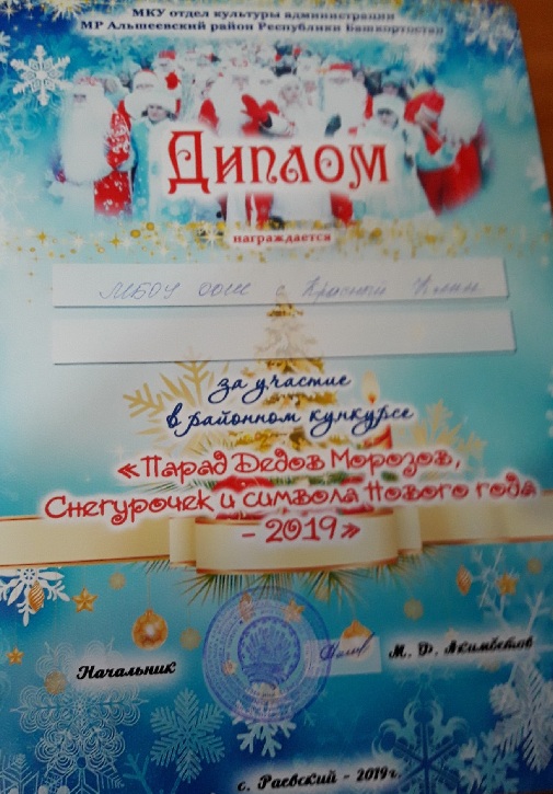 23 декабря на Советской площади села Раевский прошло ставшее уже традиционным шествие Дедов Морозов, Снегурочек и сказочных персонажей. В конкурсе принял участие и наша школа: ученица 6 класса Тихонова А. -символ года, Дед Мороз— учитель Ишаев А.Т., Снегурочка -Ахметова Л.Ф. Молодцы!!!